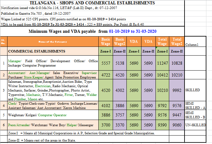The Minimum wages in Telangana has been revised with effect from 01st Oct 2019.The amended rates for all the categories are as below:-